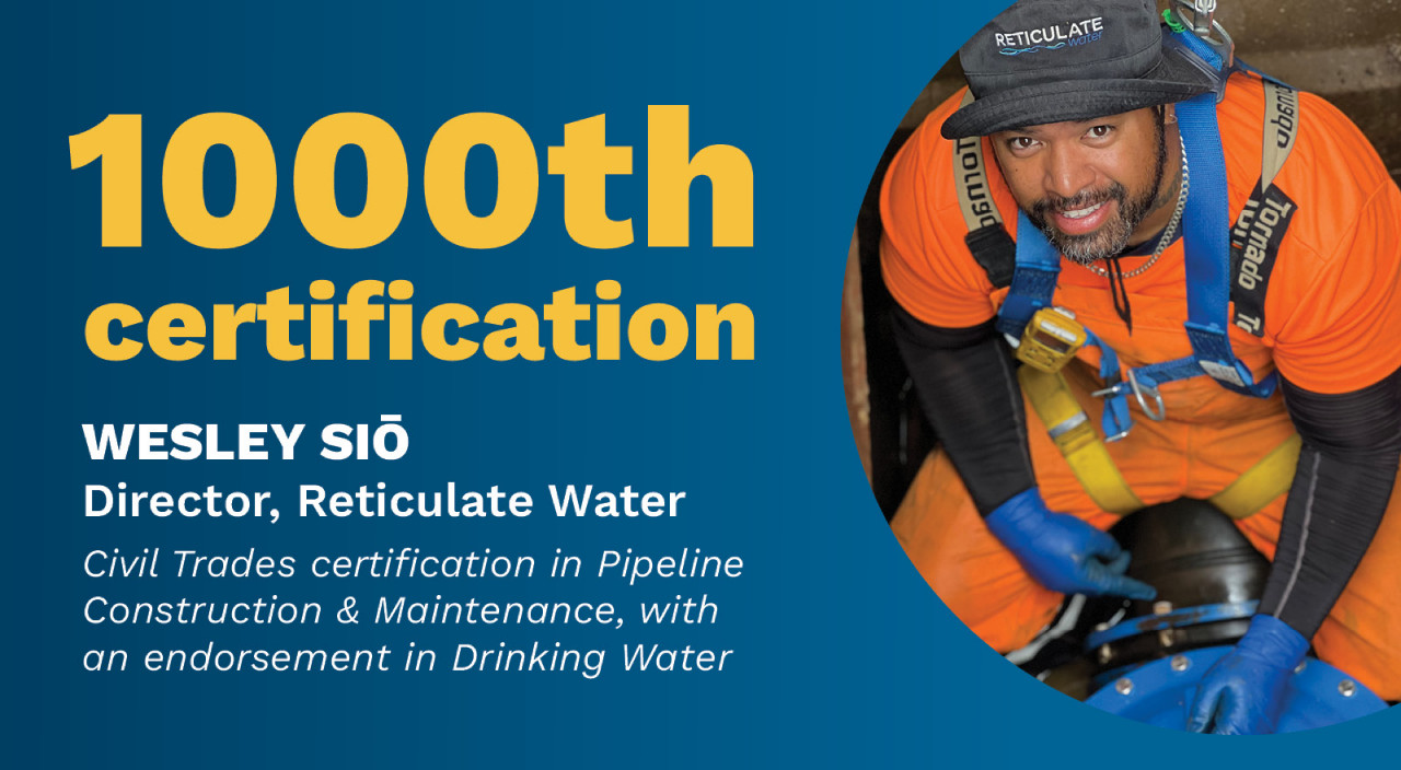 Wesley Siō, director of water services business Reticulate Water, became the 1,000th certification under the Civil Trades scheme when he recertified recently.